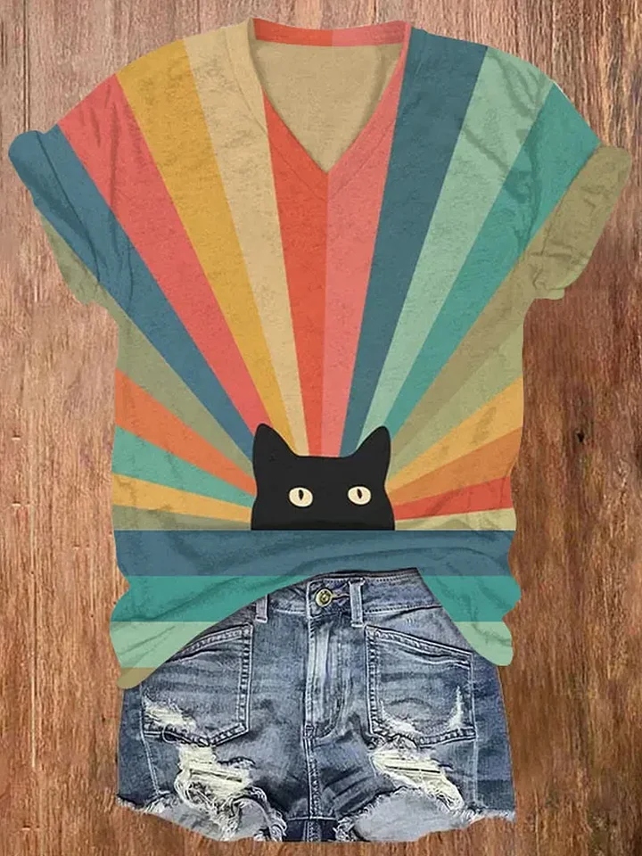 Rainbow Cat Print Short Sleeves V-neck T-shirt