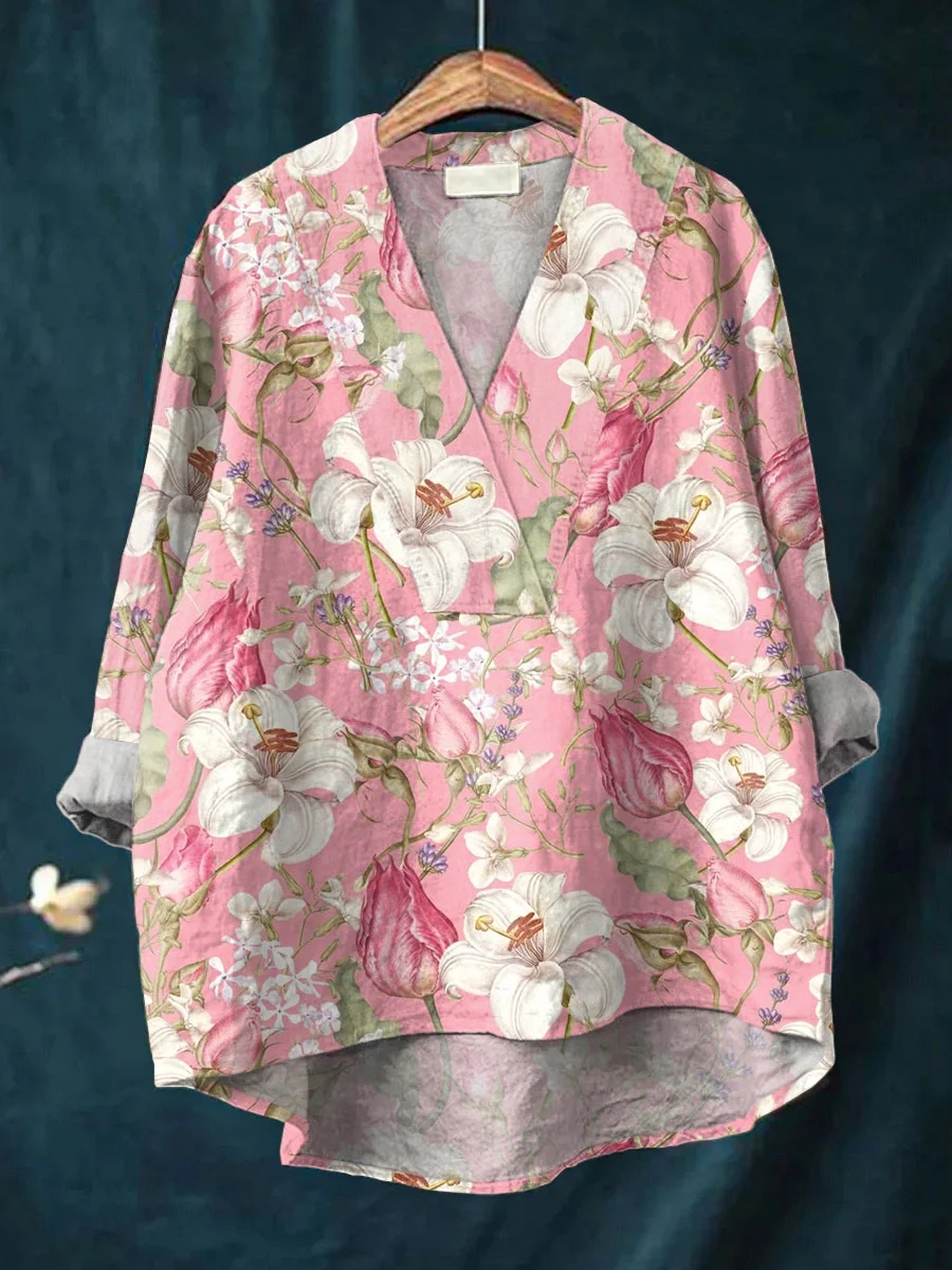 Women's Vintage Flower Art Print Casual V-neck Shirt