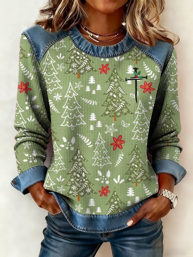 Women's Casual Christmas Denim Patchwork Top