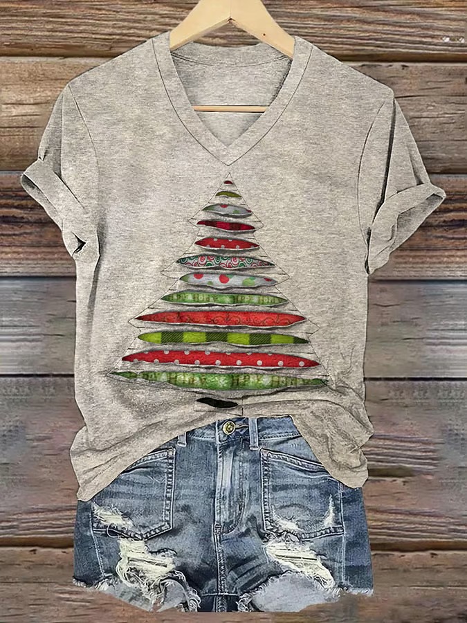 Women's Art Christmas Tree Casual V-Neck Tee